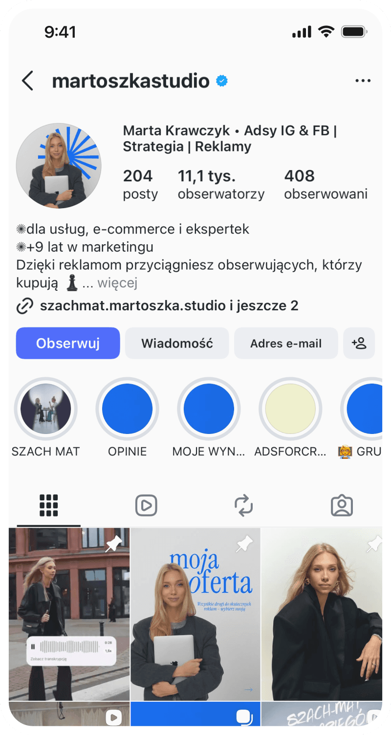 Pokazuję, jak budować kampanie, które nie tylko dobrze wyglądają w social media, ale przede wszystkim przynoszą realne efekty - nowych klientów, obserwujących i sprzedaż.
